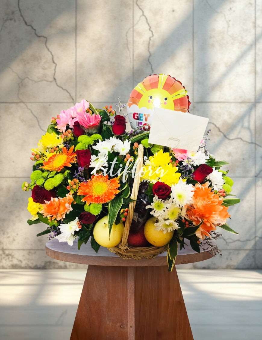 Choose BF-05 to make a memorable impression on your loved ones with our stunning floral and fruit basket arrangement. This exquisite present is perfect for prompt delivery to Metro Manila and neighboring areas. Elevate your present-giving game with this refined and unique option.