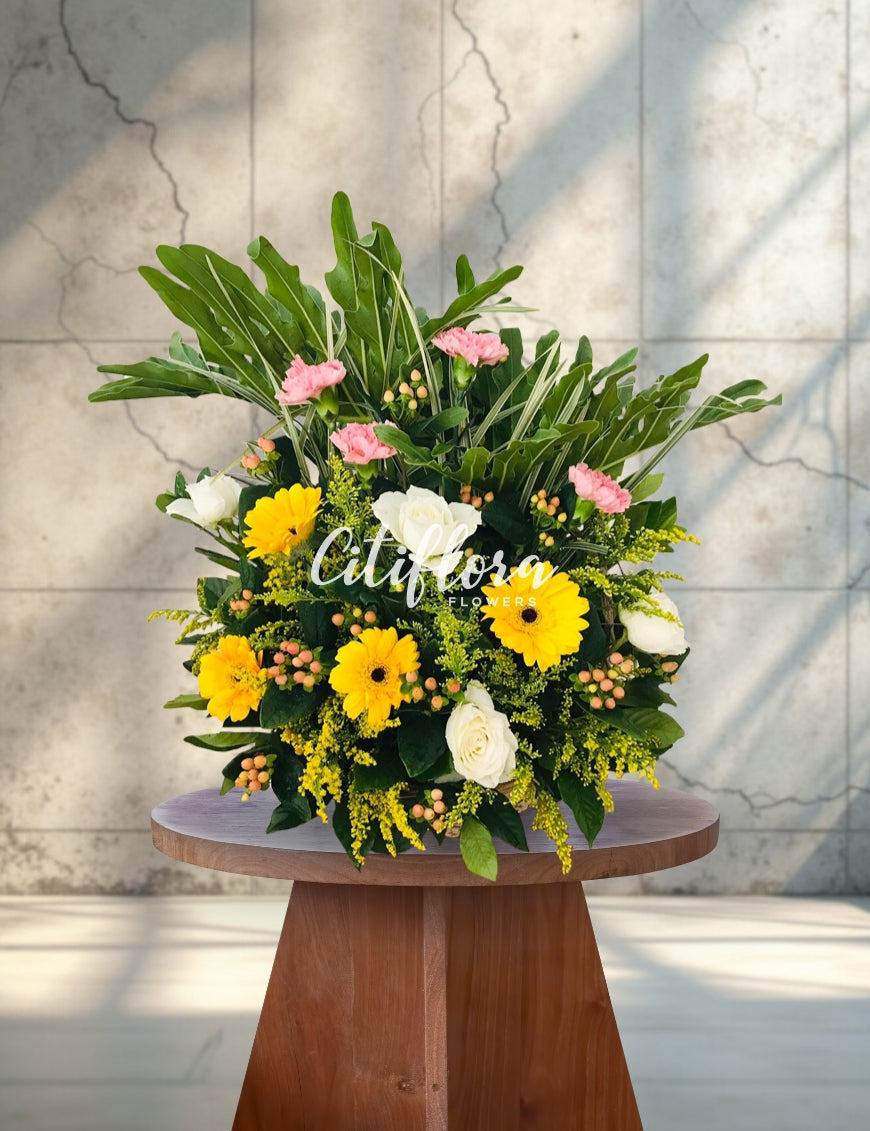 - Flowers: White Philippine Roses, Pink Carnations, Yellow Gerberas, Fillers