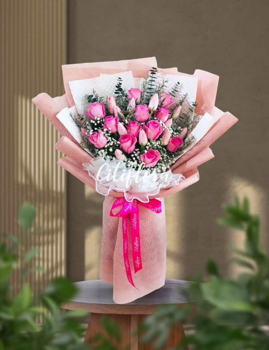 - Flowers: Pink Bangkok Roses, Tulips, Fillers