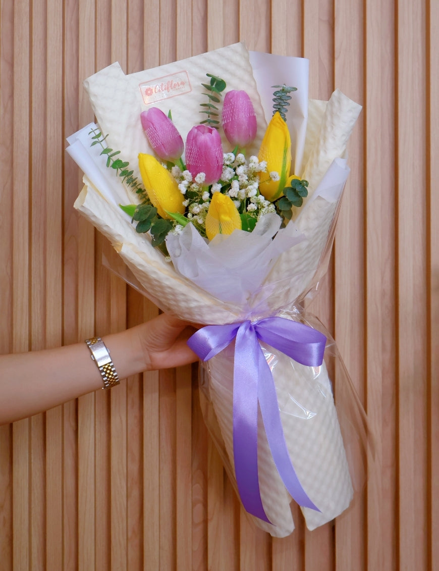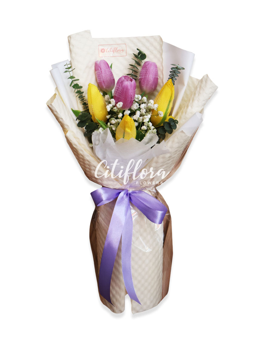 BQT-132 offers a breathtaking tulip arrangement that will enchant your loved ones for any occasion. This exceptional gift exudes joy and tenderness, conveying your profound sentiments with its elegant and fragrant blossoms.