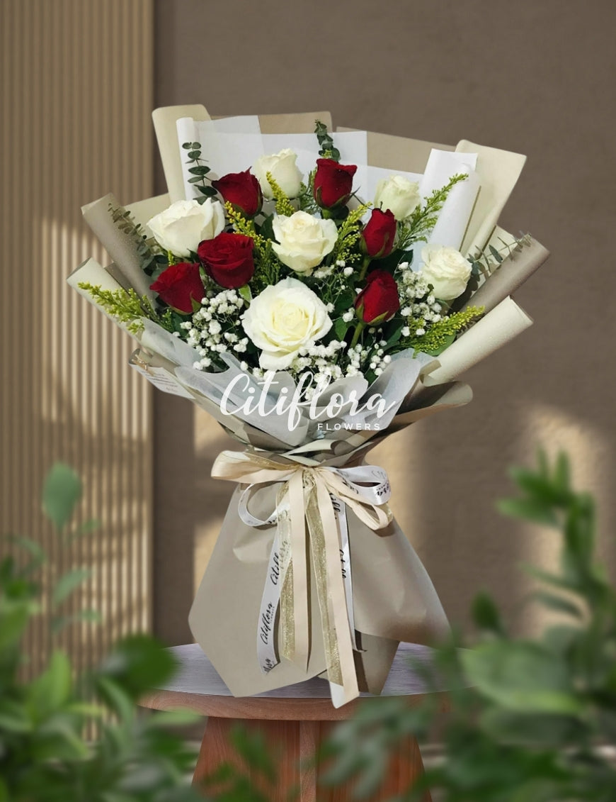 Make an impression with BQT-134, a luxurious arrangement of red and white roses perfect for any occasion. Let these beautiful and fragrant flowers enhance their celebration with happiness and fondness. Share your love and gratitude with this thoughtful and exquisite gift.