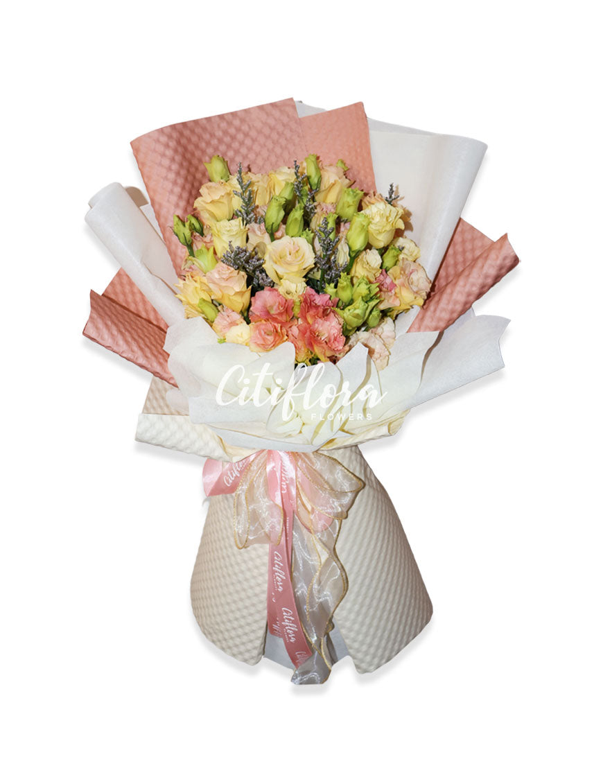 - Flowers: Yellow Peach Lisianthus, Fillers