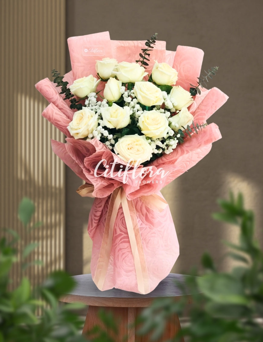 Win over your favorite people with BQT-154, a dazzling bunch of snowy white roses that's ready to steal the show at any celebration! These gorgeous blooms aren't just pretty faces—they'll fill the air with delightful scents that turn ordinary moments into magical memories. Surprise someone special with this charming bouquet and watch their face light up with joy as they unwrap this irresistible floral treasure!