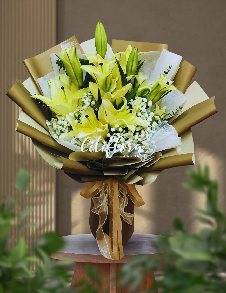 Celebrate meaningful moments with BQT-167, an exquisite arrangement of radiant yellow lilies. Each bloom radiates warmth and elegance, making it an ideal choice for expressing genuine appreciation and affection. The delicate fragrance and refined presentation transform this bouquet into a timeless gift that speaks volumes about your thoughtfulness, creating lasting impressions and cherished memories for those you hold dear.