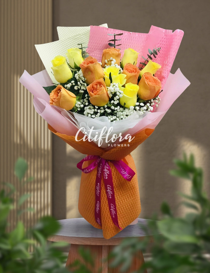 BQT-182 presents a stunning arrangement of imported yellow and orange roses, perfect for gifting on any occasion. This sophisticated bouquet combines warm, radiant tones that convey joy, gratitude, and admiration. Ideal for celebrating achievements, expressing appreciation, or brightening someone's day with elegance and charm.
