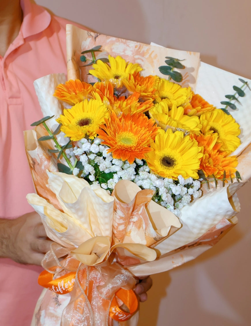 - Flowers: Yellow & Orange Gerberas, Fillers