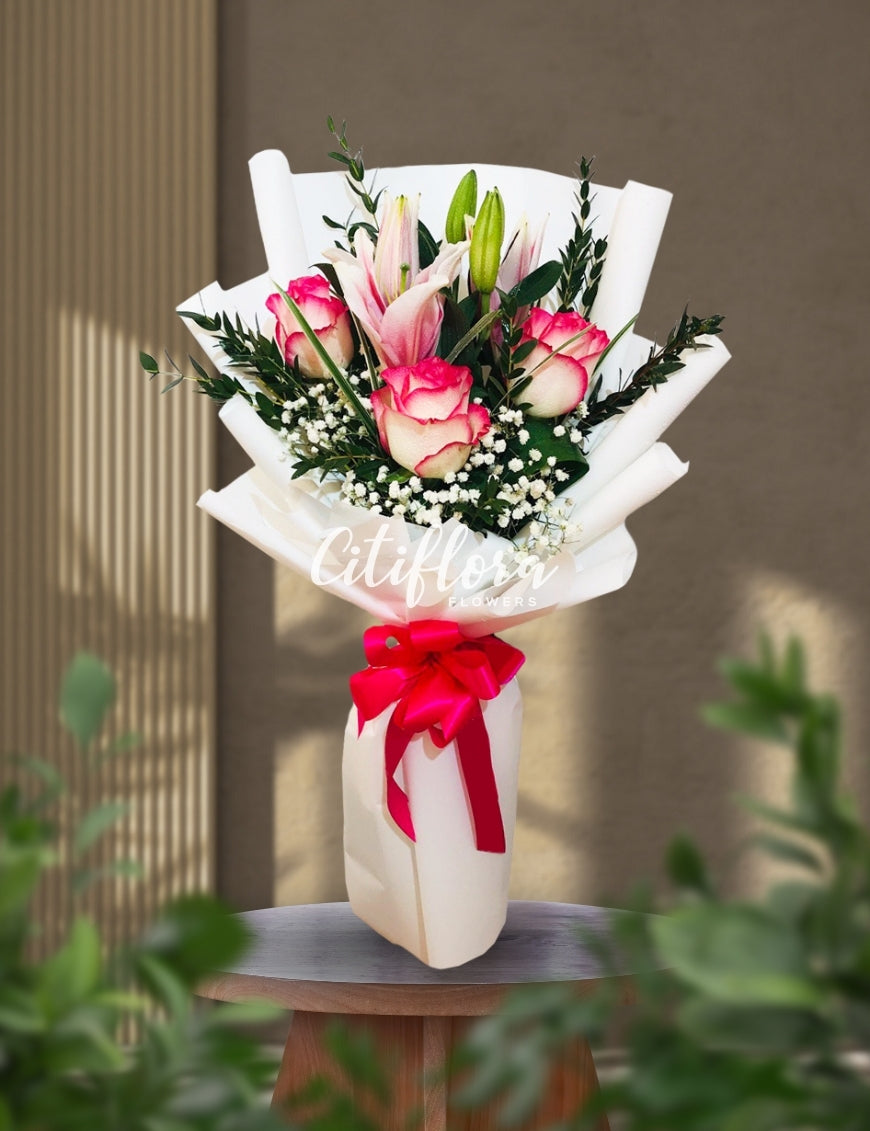 - Flowers: Two-toned Pink Bangkok Roses, Pink Lilies, Fillers