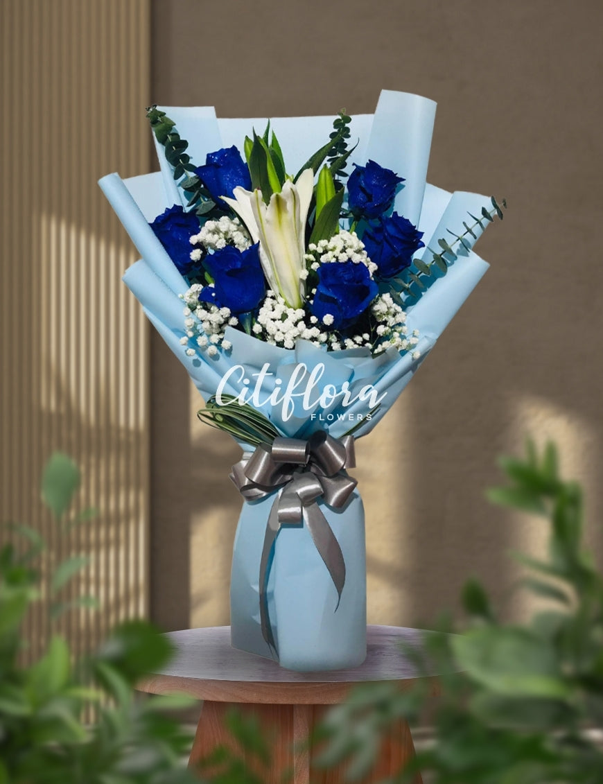- Flowers: Blue Spray Painted Bangkok Roses, White Lilies, Fillers