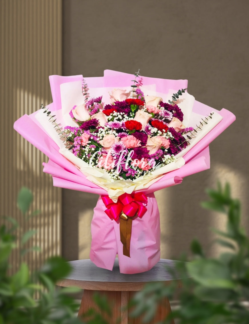 - Flowers: Pink Bangkok Roses, Red & Pink Carnations, Mixed Mums, Fillers