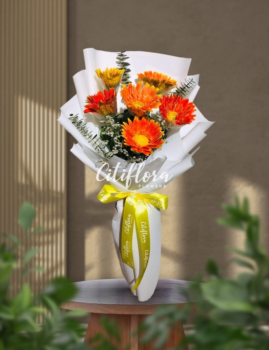 - Flowers: Orange Gerberas, Fillers