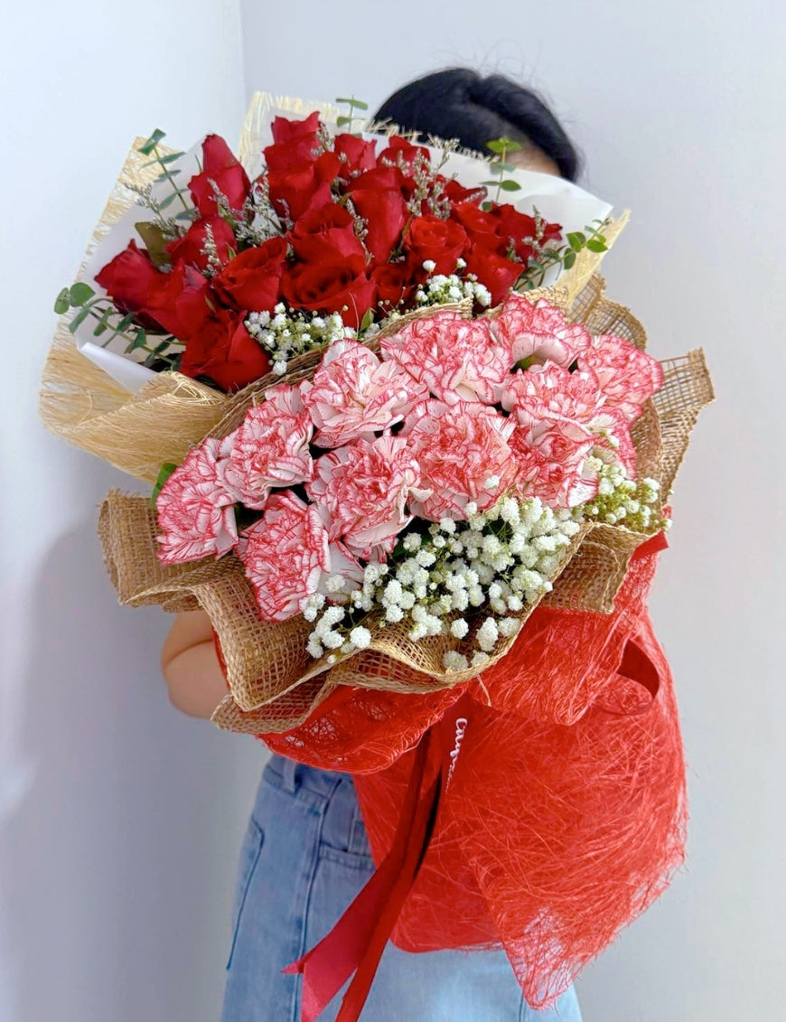 - Flowers: Red Philippine Roses, Pink Carnations, Fillers