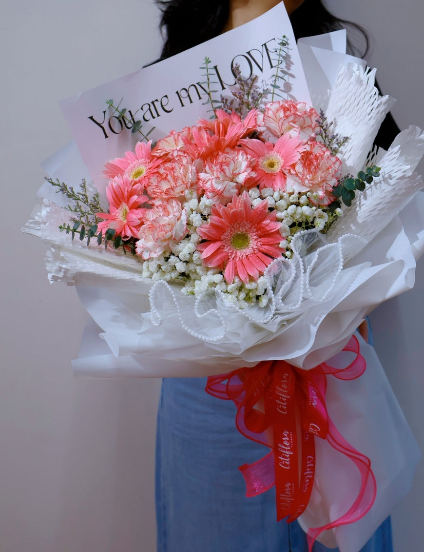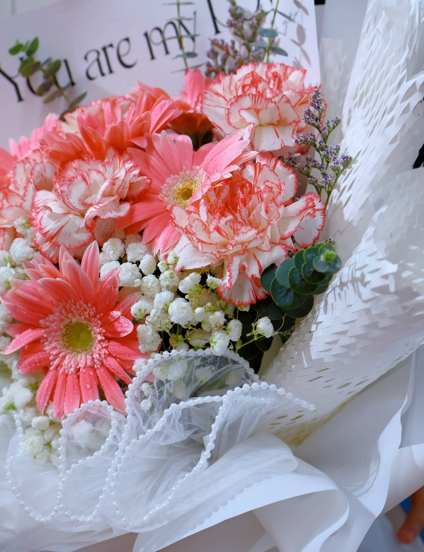 - Flowers: Pink Carnations, Gerberas, Fillers