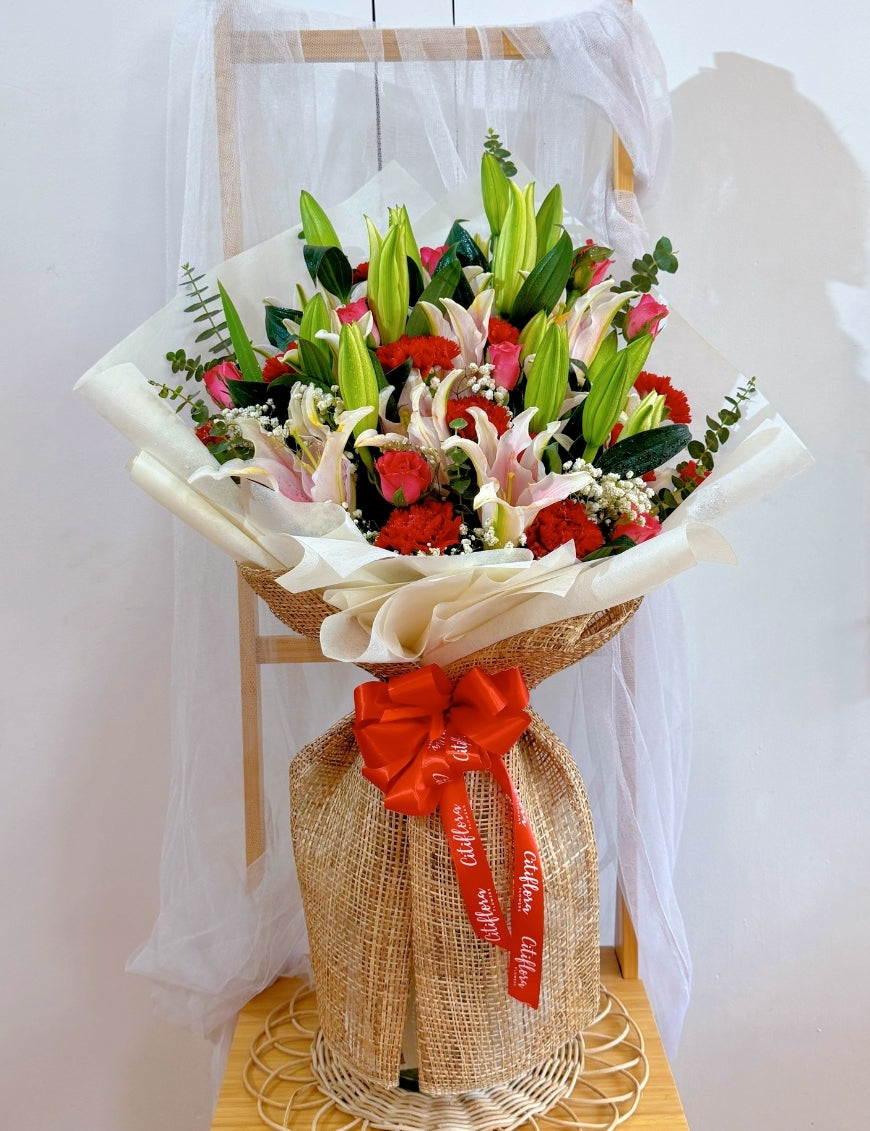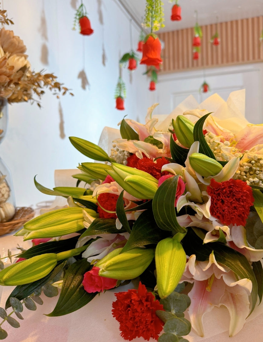 - Flowers: Pink Philippine Roses, Red Carnations, Pink Lilies, Fillers