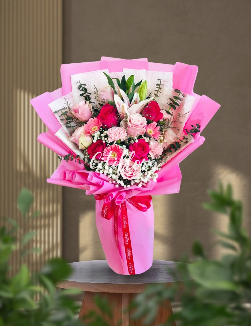 - Flowers: Pink Ecuadorian Roses, Carnations, Gerberas, Lilies, Fillers