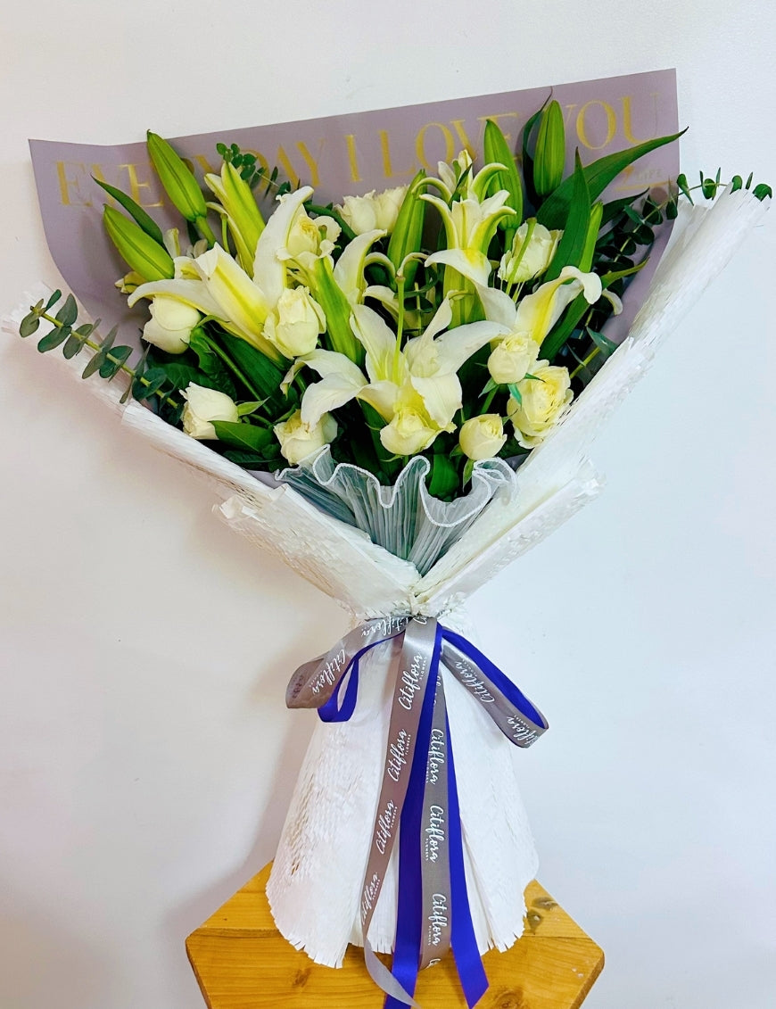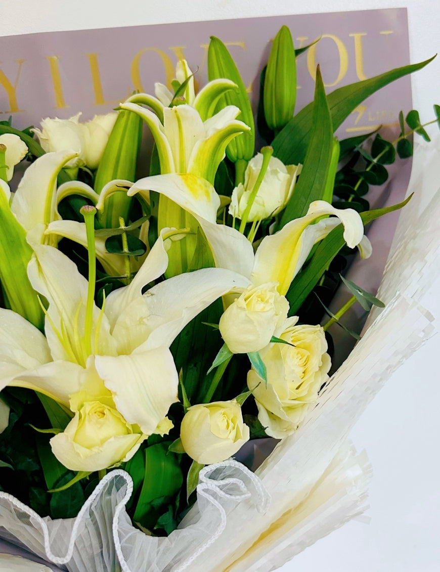 - Flowers: White Philippine Roses, White Lilies, Fillers