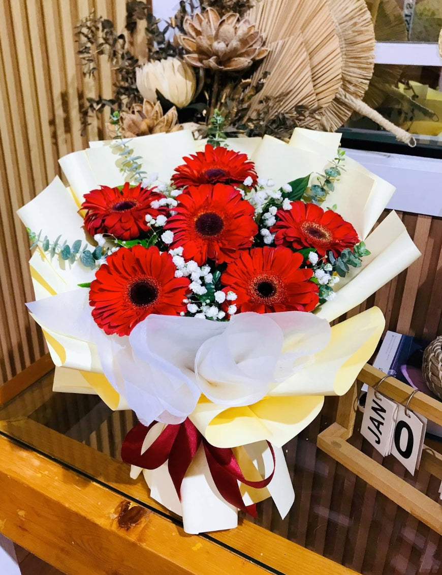 - Flowers: Red Gerberas, Fillers