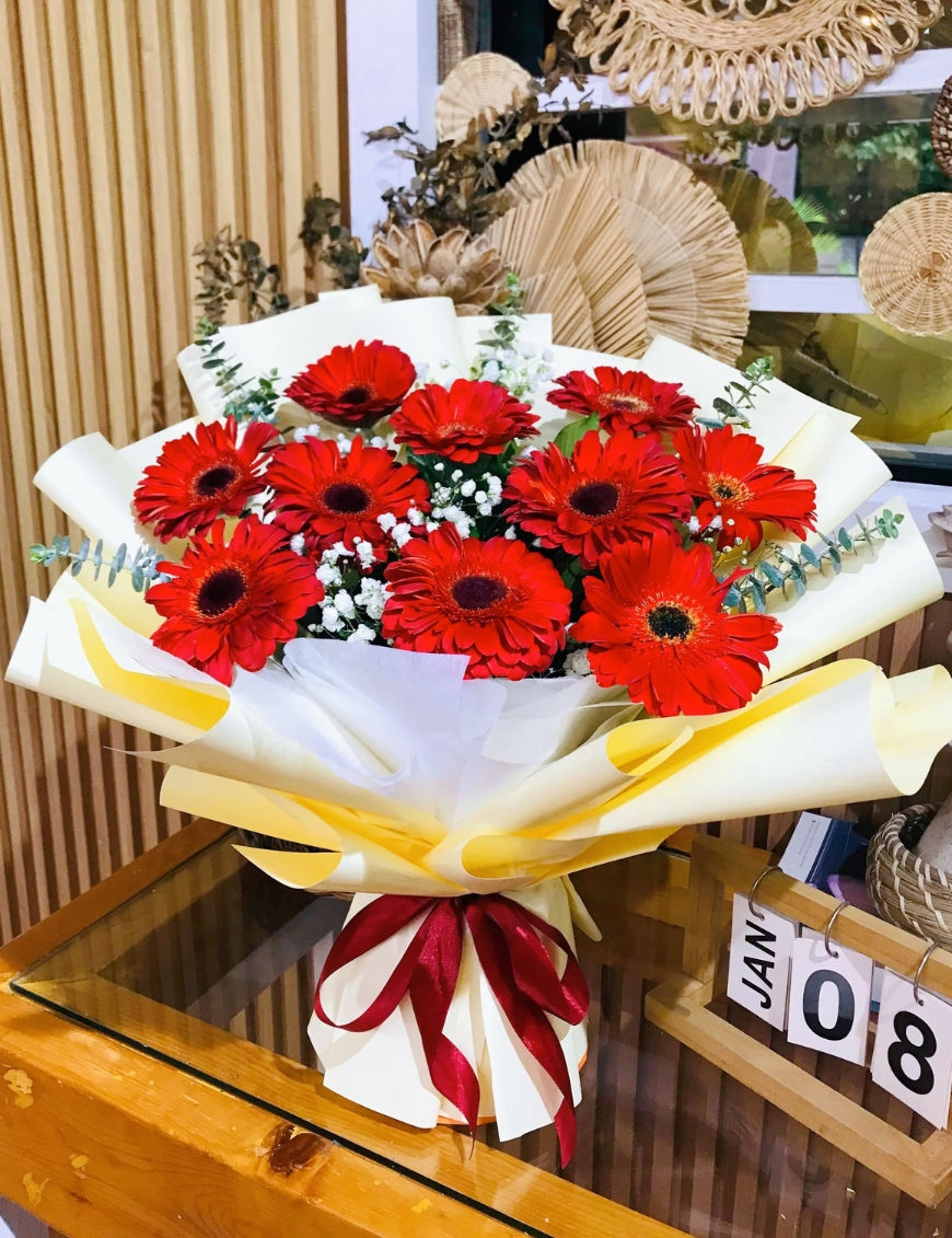 SB-10 is a stunning arrangement of red gerberas, perfect for expressing heartfelt emotions on special occasions. Each bloom is carefully selected for its beauty and elegance, creating a sophisticated gift that celebrates meaningful moments.