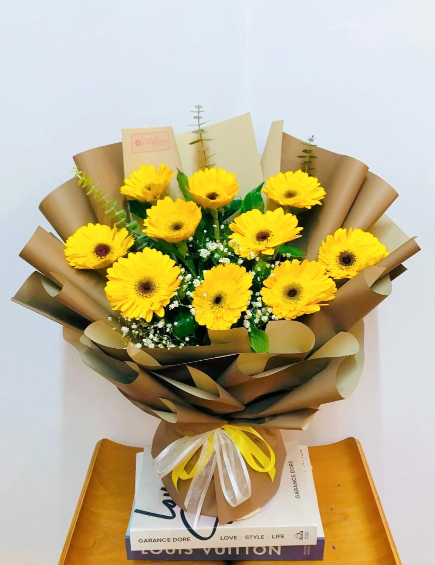 SB-15 presents a refined selection of vibrant yellow gerberas, perfect for expressing heartfelt emotions on special occasions. Each bloom is carefully chosen to deliver both visual elegance and subtle fragrance.